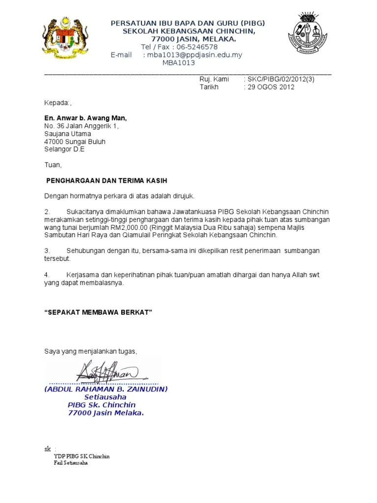 27 contoh surat terima kasih atas sumbangan. Contoh surat ucapan terima kasih atas sumbangan kewangan bagikan contoh. Penghargaan atas sumbangan tajaan majlis hi tea untuk mengisi tabung pibg smpk vokasional indahpura, kulaijaya, johor. Surat penghargaan hhin 09 salam .